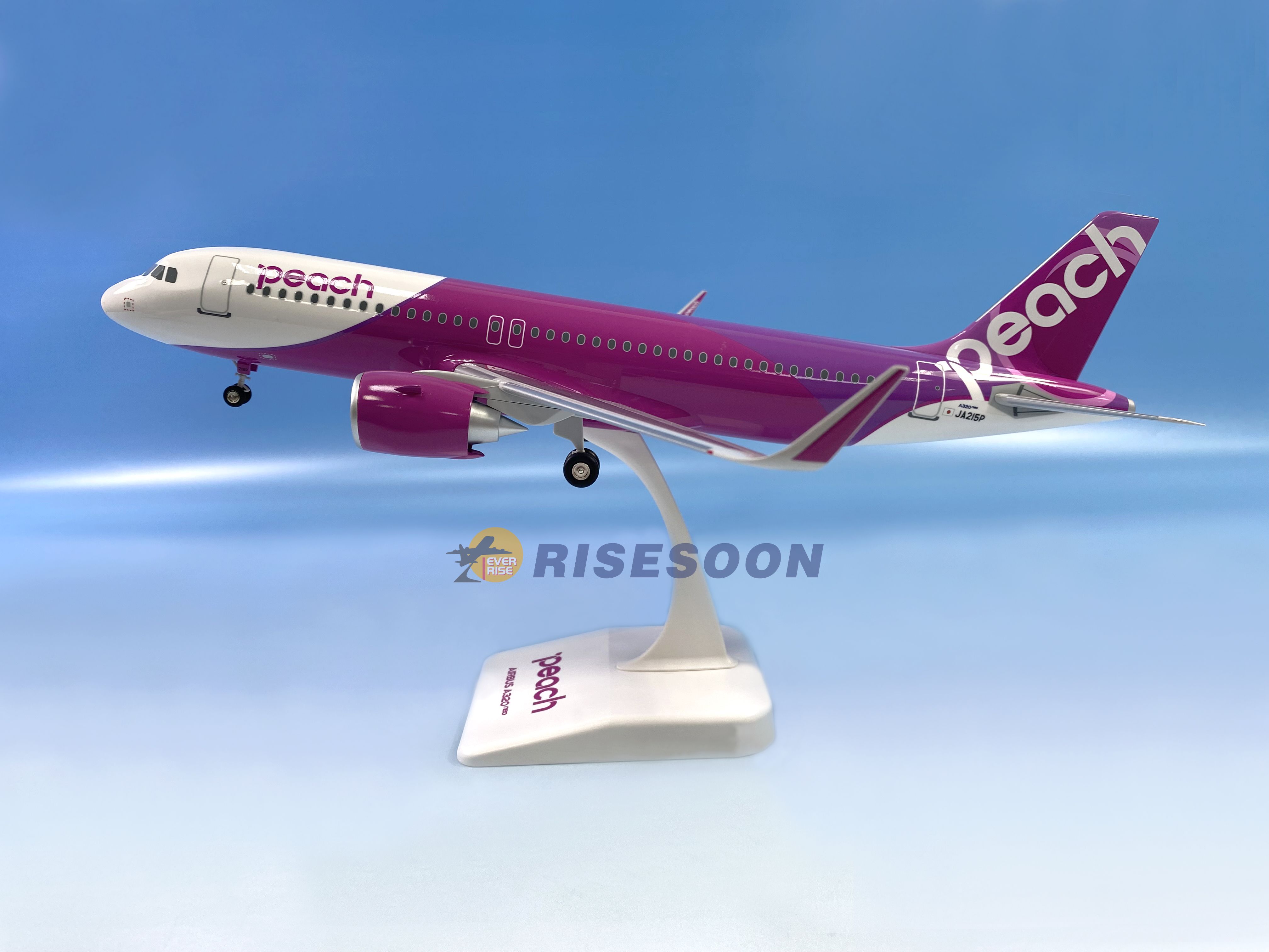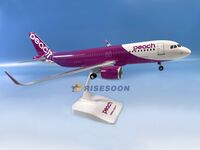 Airlines:Peach Aviation Aircraft:A320 Registration:JA215P Material:Solid ABS Size ( LxW ):386 x 360 mm Scale :1/100 Parts:Landing Gear included+Rotating Engine+Plastic Stand